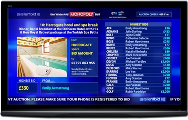 SilentBid's unique split screen presentation and high-quality HD graphics means that guests are always in touch with what's going on. One half of the screen scrolls information and pictures for each of the auction lots, while the other half of the screen shows a league table of highest bids and bidders.